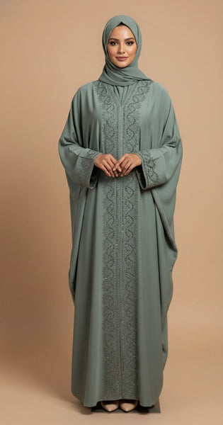 Abaya de couleur verte avec strasses sur le devant et derrière.