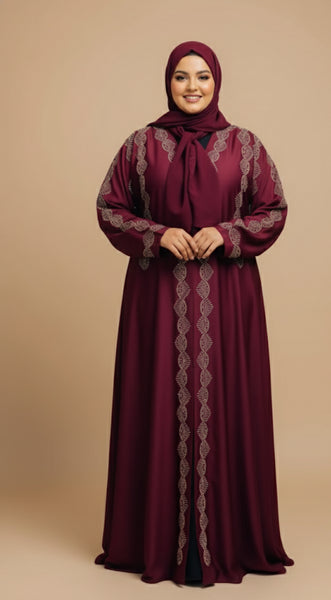 Abaya rouge avec des strasses sur le devant et l’arrière (petite ceinture). Inclus foulard assorti.
