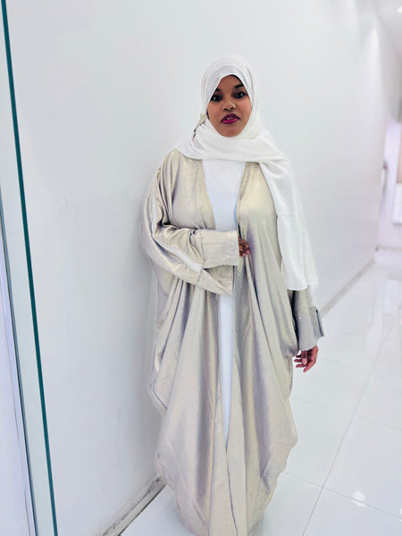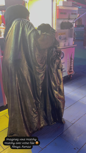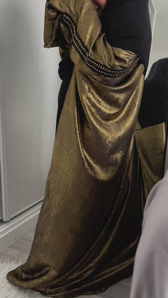 Kimono couleur or avec des strasses dorés de l'épaule jusqu'aux manches et sous abaya noir. Inclus foulard assorti.