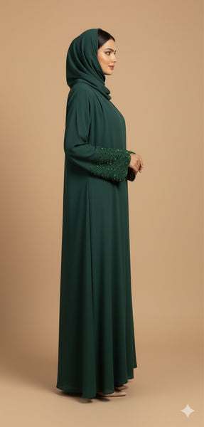 Abaya avec strasses sur les manches et sous abaya verte.