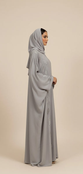 Abaya de couleur grise ou orange avec des motifs strasses pailletés . Inclus foulard assorti.