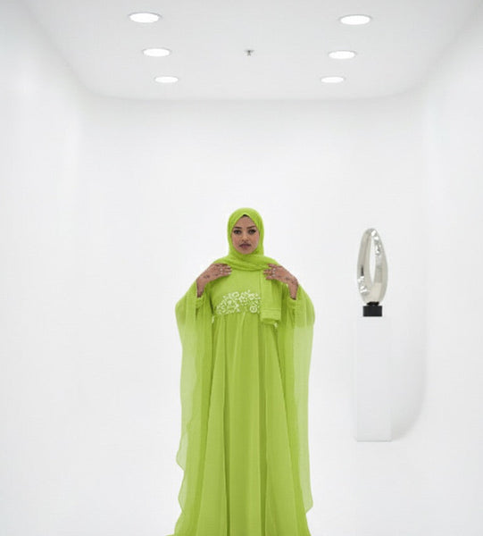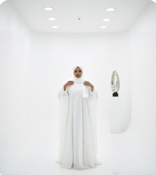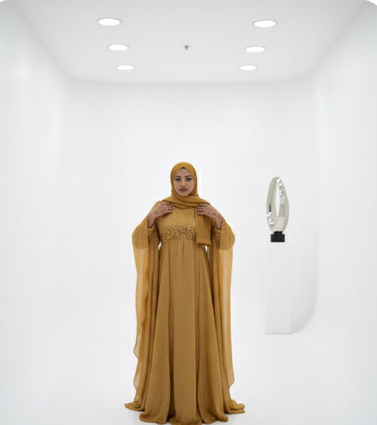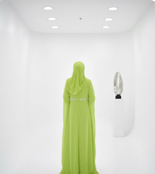 c’est une abaya satinée composé d’une cape organza avec des strass et des perles